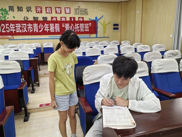 七月的武汉,暑气正盛,位于姚家集街道的姚集社区青少年空间的托管班里却透着沁人的热闹,折纸的沙沙声、算题的小声嘀咕、追着老师问问题的童声混在一起,织成一首独属于夏天的成长序曲。在这些穿梭忙碌的身影里,有一张面孔格外特别,他就是今年刚刚高中毕业的18岁的朱立文。刚结束高考,填报完志愿后他便联系了当年的老师王烨。“我愿意来当志愿者,小时候我在托管班里学到了很多知识,人也变得开朗了。现在我有充足的时间,也有能力照顾小孩,我会尽我所能回报这里。”